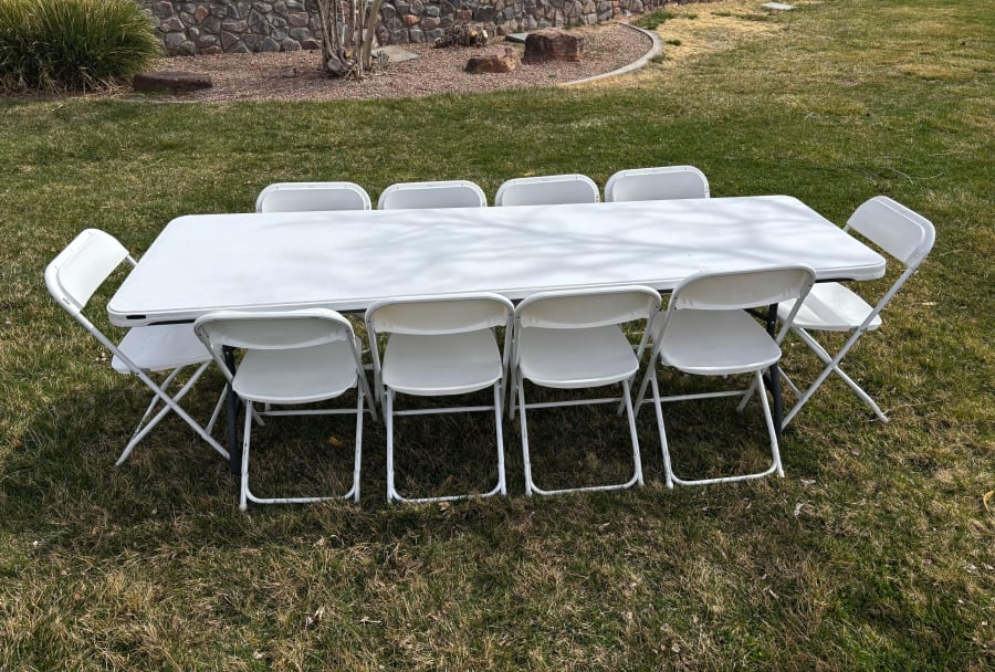 8-foot table with 10 chairs. We offer this as a package deal so reserve yours today!